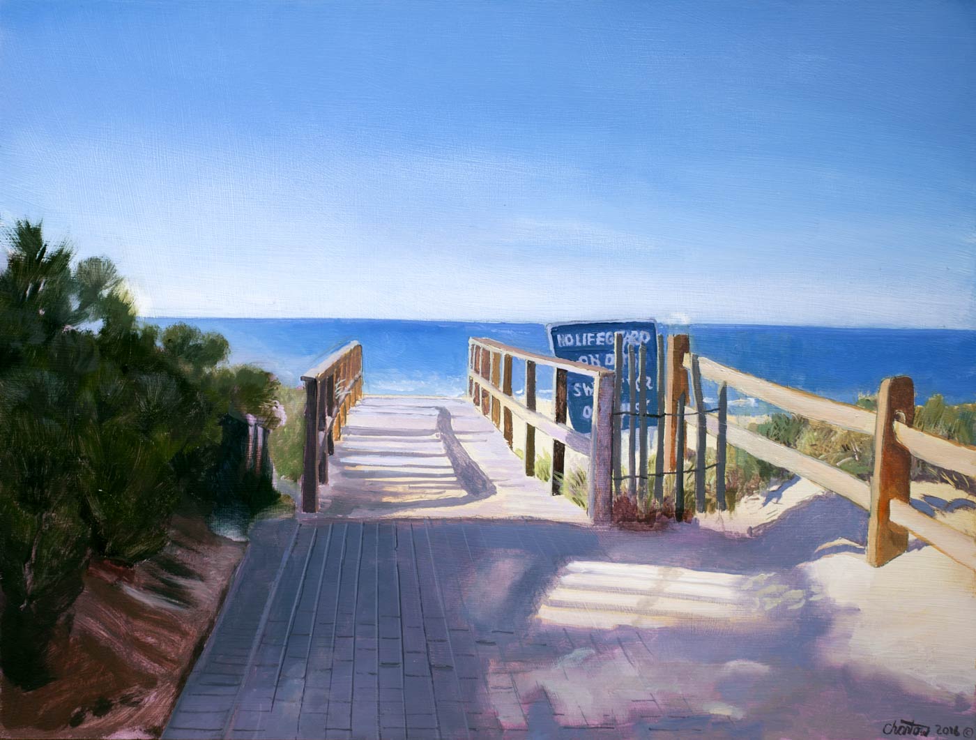 The path inclines gradually until it is level with the top of the dunes. Then down the steps and you are on the bright summer morning beach. Life is good.